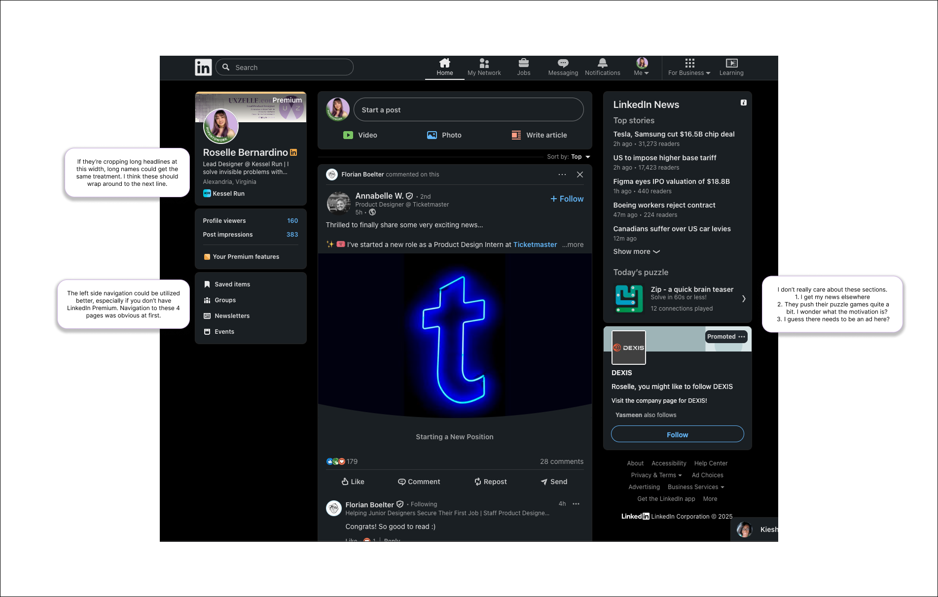 Screenshot I used for reference in Figma Make. Prompt: Using LinkedIn's interface, replace the Promoted section with the Saved Section. User has the option to tab through saved posts, jobs, or Learning videos, ability to filter, sort, and tag saved items, and search with a search bar.(Left) Bolt.new version done in July 2025. (Right) Figma Make version.Key Design Decisions